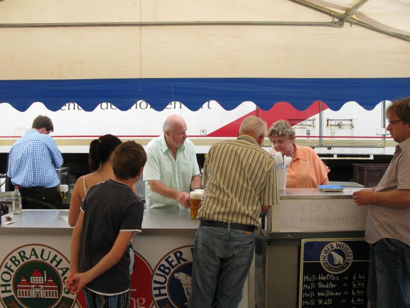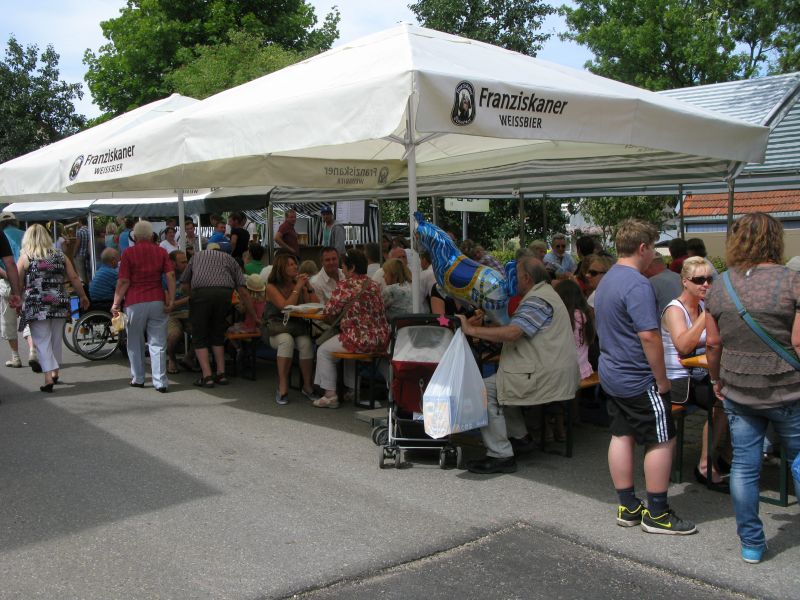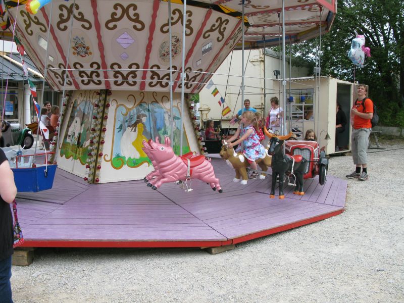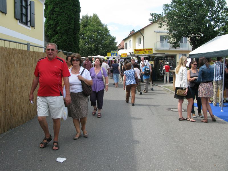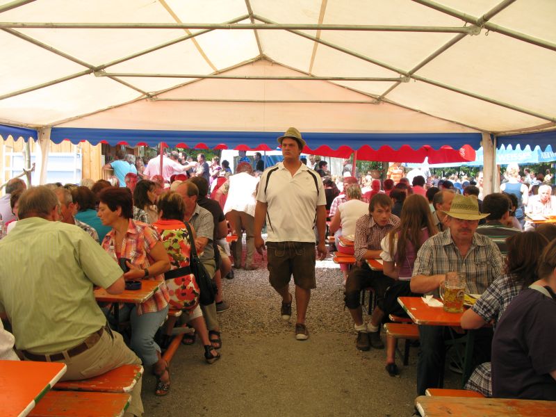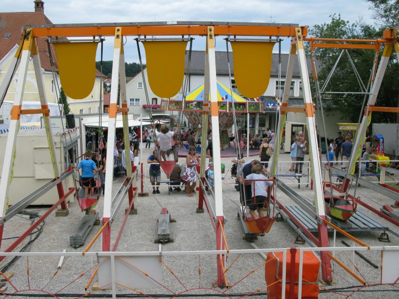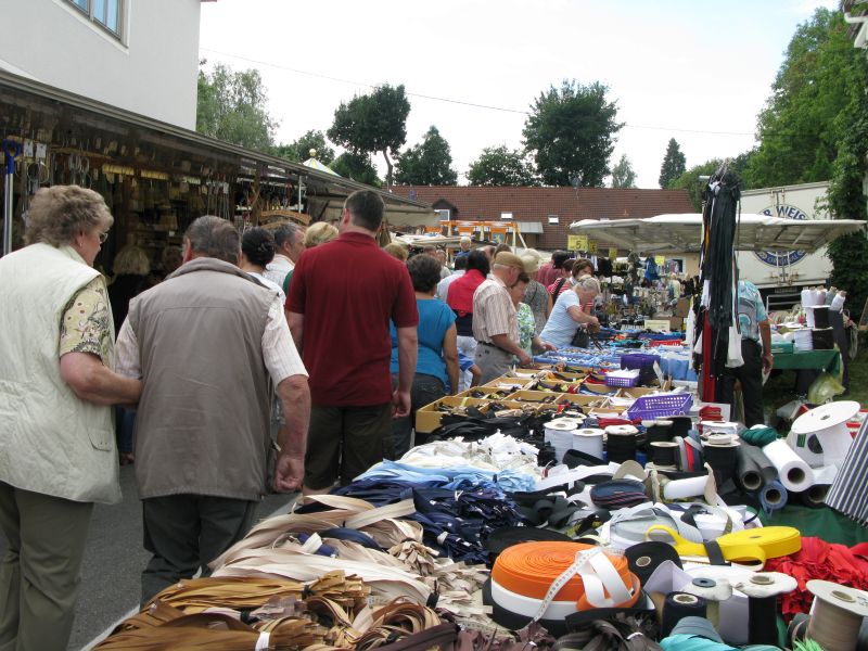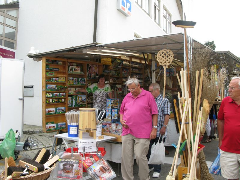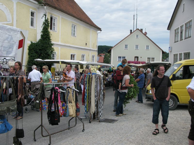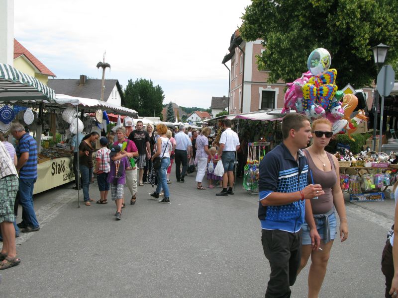 Am Fuße des Schlossbergs aber: Wunderbares Wetter, über 200 Fieranten, ein unfassbares Angebot an außergewöhnlichen Waren und kulinarischen Genüssen – und die Gäste hatten ihr Vergnügen in der Budenstraße. Beim Metzger Buchberger spielte eine Band zur Untermalung der kulinarischen Genüsse auf – „a Mass und a Schweinswürstl genga no imma!“ –, bei Gianni gegenüber dominierten italienische Schmankerl, der Biergarten beim Postwirt war besetzt bis auf den letzten Platz, und die Kinder freuten sich über den Schwung auf der Schiffschaukel und eine neue Runde auf dem Karussell. Unglaubliche Raritäten bot der Flohmarkt des TSV für geduldige Entdecker, in der Weinlaube des Tennisclubs saßen nicht nur die, die einen edlen Tropfen, sondern auch ein Weißbier nebst Kaffee und Kuchen zu schätzen wissen, und abends zog es die Jungen und Junggebliebenen in die Disco unter dem Maibaum.