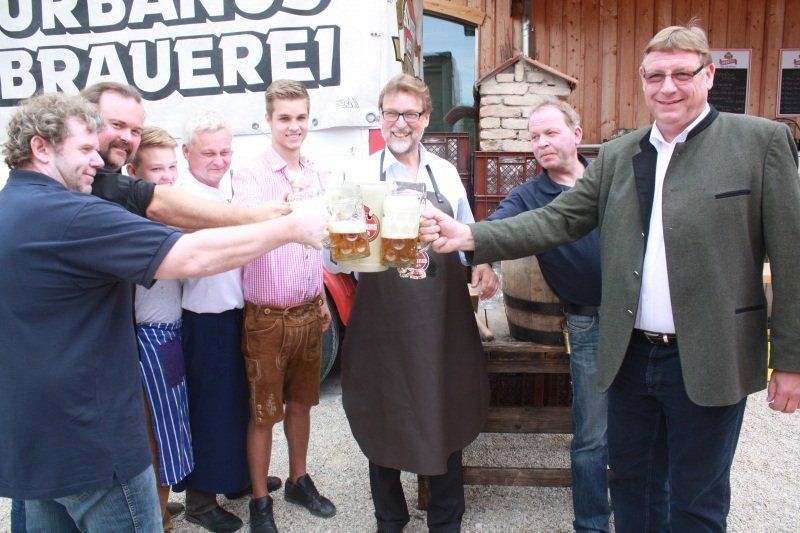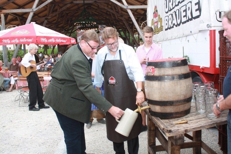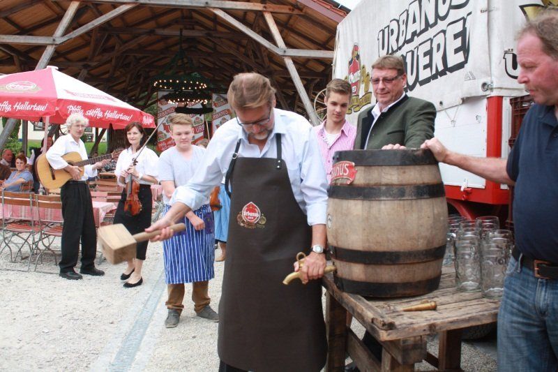 Die große Ehre der Eröffnung und damit des Anzapfens des ersten Fass Urbanus Zwickel naturtrüb, ein Festbier das eigens anlässlich der in diesem Jahr stattgefundenen 400 Jahrfeier der Brauerei gebraut wurde, hatte Landrat Martin Wolf. Mit vier gezielten Schlägen und ohne viel vom goldenen Gerstensaft zu verspritzen meisterte er diese Aufgabe unter den strengen Blicken der Veranstalter Stocker, Schwarz und Descy, sowie dem Braumeister Hans Jurkus und dem Geschäftsführer der Urbanusbrauerei Klaus Markfelder.