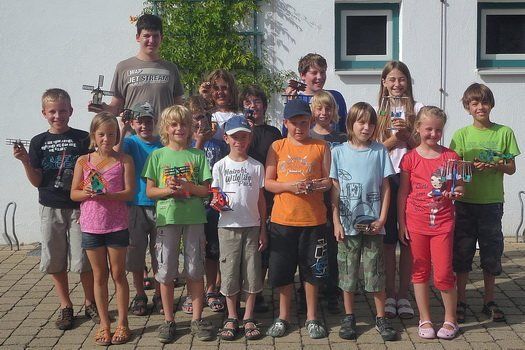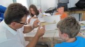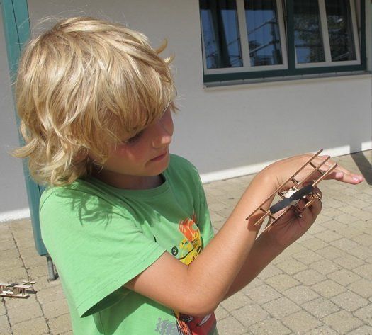 Nachdem alle Modelle funktionstüchtig und ausreichend bemalt waren, wurden sie stolz präsentiert und ausprobiert. Faszinierend ist es ja schon, wenn sich der Propeller des Doppeldeckers dreht - und das allein durch Sonnenenergie. „Das ist ja fast wie ein Ventilator“, kam sofort aus dem Mund der Kinder. Bei dieser Hitze hatte sich nach der Anstrengung auch wirklich jeder sein Eis verdient.