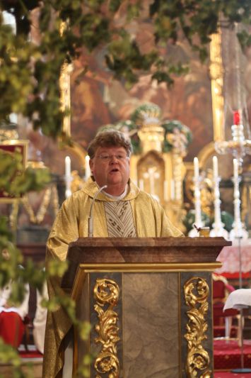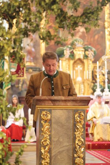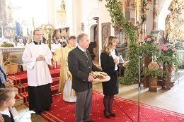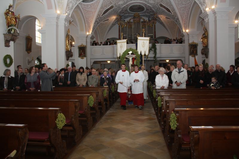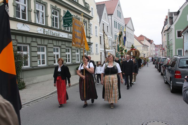 Auch in diesem Jahr fuhren die Landwirte gute Erträge ein, und blieben vom Unwetter weitgehend verschont. Gerade deswegen soll man Gott nicht vergessen. Aus seiner Kraft heraus sprießt die Natur, und bildet so die Grundlage für unsere Nahrung. Mit einem Festzug, der den Auftakt bildete wurde die Erntekrone in den Dom der Hallertau getragen. „Ich möchte mich“, so Pfarrer Johann Braun gleich zu Beginn, „ beim Obst- und Gartenbauverein und bei der Marktkapelle und den Schülern der 4. Klassen für die Gestaltung das Gottesdienstes bedanken.“