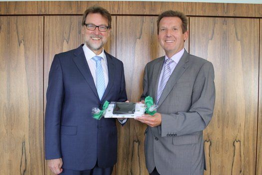 Eine besondere Geldbörse gab es für Heinz Grusdat zum Abschied: Sie ist mit der Aufschrift „Heinz Grusdat – Kreiskämmerer a.D.“ versehen.