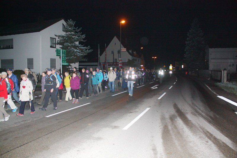 Geisenfelder, Dachauer, Eichstätter und natürlich auch zahlreiche Wolnzacher, trafen sich um kurz vor drei in Wolnzach, um in der St. Laurentius Kirche den Segen für „den Weg des Friedens“ zu erbitten. Anschließend kehrte man mit dem Hopfenkreuz vorne weg und bei sternenklarem Himmel Wolnzach den Rücken. Mit flottem Schritt ging es Richtung Nandlstadt, wo nicht nur weitere Pilger zur Gruppe stoßen werden, sondern auch die erste Rast eingelegt wird.