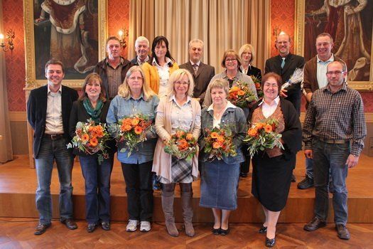 Dienstjubiläum bei der Stadt Pfaffenhofen mit (vorne von links) Bürgermeister Thomas Herker, Rosi Heiß, Monika Busch, Brigitte Friedl, Emmy Lammel, Elisabeth Kronberger, Personalratsvorsitzender Jürgen Regau und (hinten stehend von links) Oskar Braune, Alois Ott, Heidi Gernet, Arno Haselsteiner, Monika Giese, Evelyn Moll, Thomas Gschrey, Franz Käser.