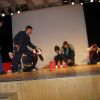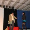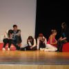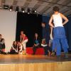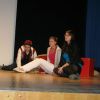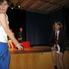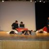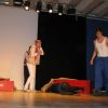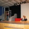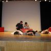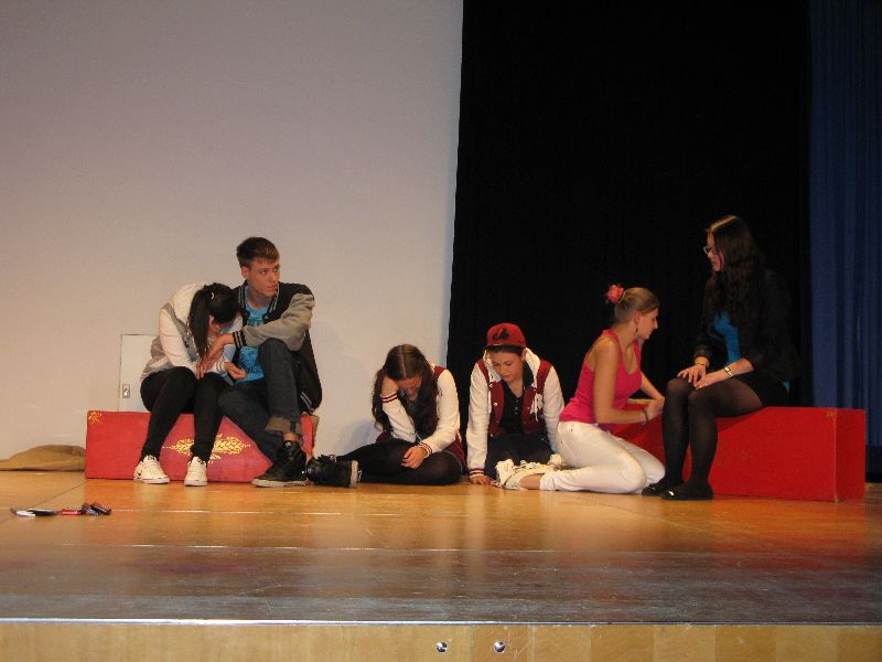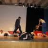 Fetzig ging die Story unter dem Titel „Tatort: Bühne“ weiter in der Aula des Gymnasiums. Die Frage, ob Bühne oder Leinwand, ob Theater oder Film, entschieden die Schüler des P-Seminars salomonisch und wählten beides. So entwickelte sich ein eleganter Wechsel zwischen turbulenten Szenen auf der Bühne, quasi „live“, und den eingespielten Filmsequenzen auf der Leinwand, die die Parallel-Handlung, quasi im „Off“, für das Theaterpublikum greifbar machten.