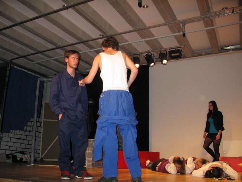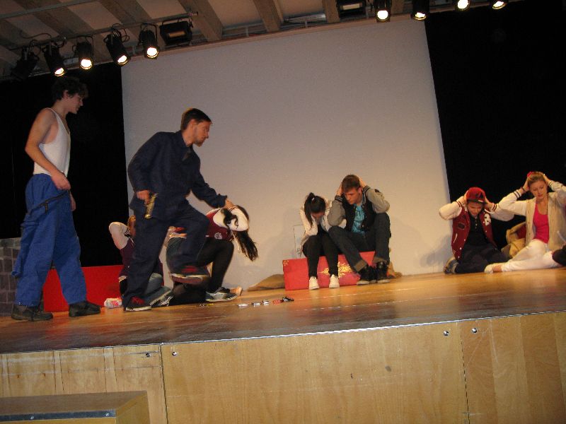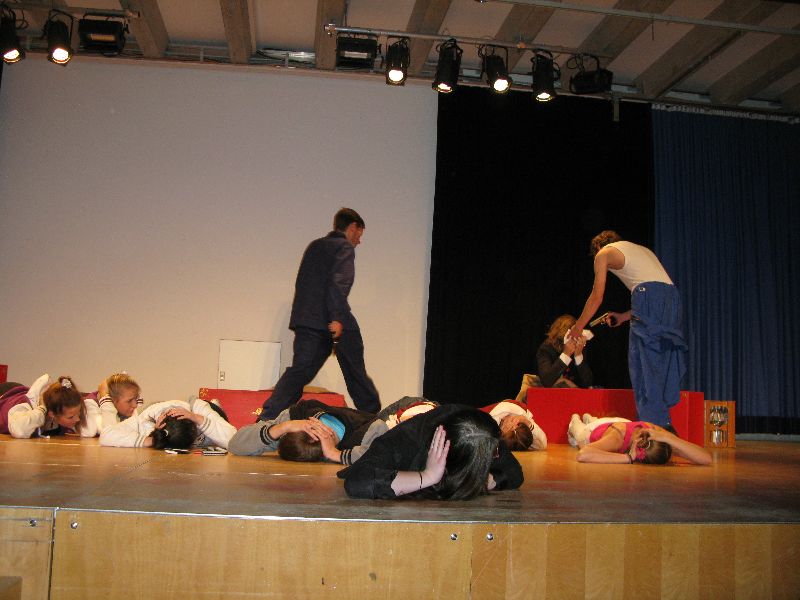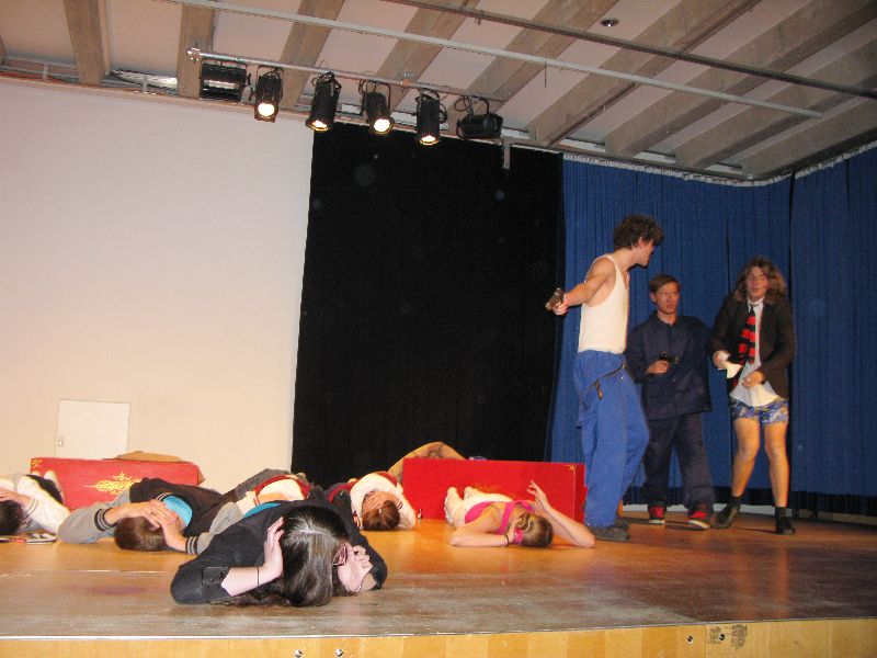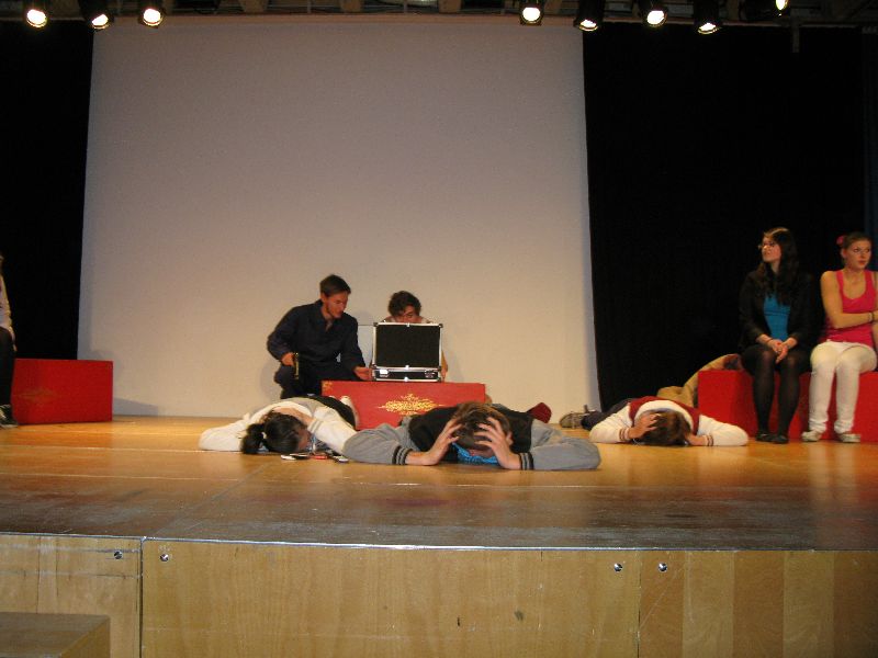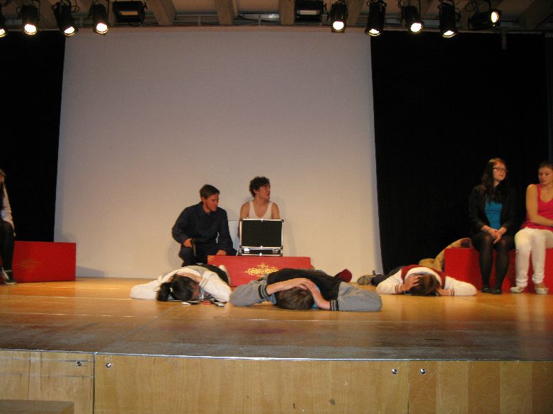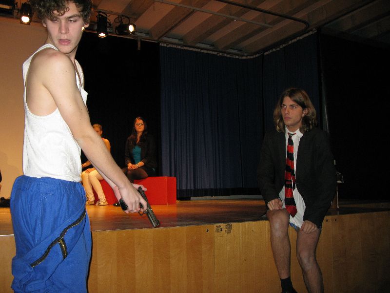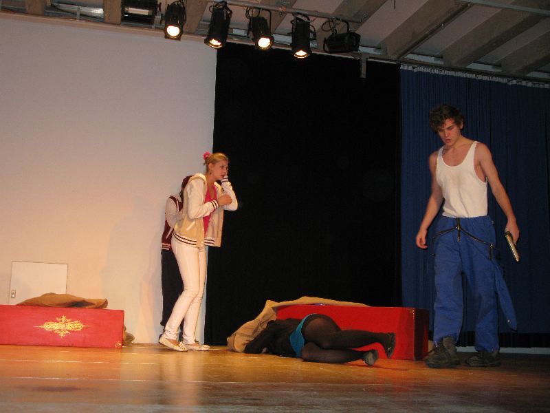 Zwei aus dem Gefängnis geflohene Jugendliche nehmen die Musical-Gruppe als Geiseln, um sich das nötige „Kleingeld“ für die weitere Flucht zu erpressen, eine Million Euro, die der Schulleiter in Unterhosen überbringen muss – alles präsent und eindrucksvoll interpretiert von den jungen, durchweg ambitionierten Schauspielern. Die „Action“ auf der Bühne verbindet sich mit den Vorgängen außerhalb: Per Film fängt der Polizeiapparat an zu arbeiten, Journalisten werden aktiv, der Psycho-Krieg zwischen Polizei und Geiselnehmern springt perfekt getimt von der Bühne in die Leinwand, von der Leinwand zurück auf die Bühne – bis zum bitteren Ende.