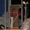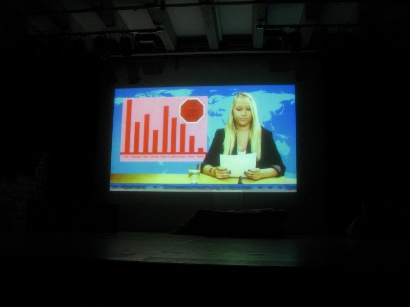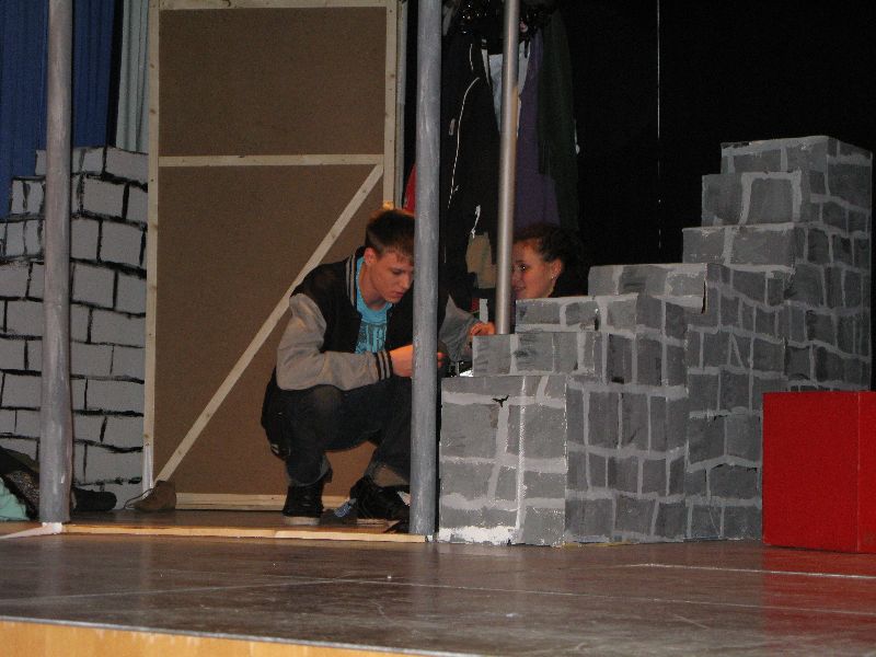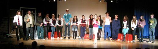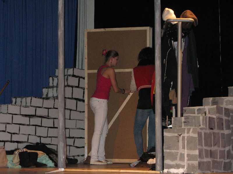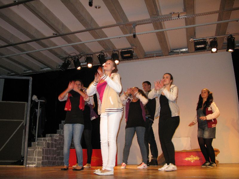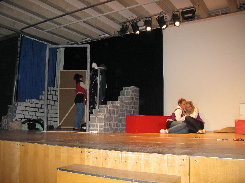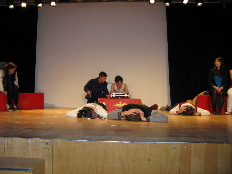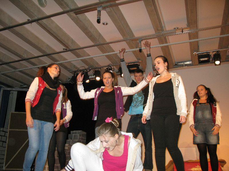 Zwei aus dem Gefängnis geflohene Jugendliche nehmen die Musical-Gruppe als Geiseln, um sich das nötige „Kleingeld“ für die weitere Flucht zu erpressen, eine Million Euro, die der Schulleiter in Unterhosen überbringen muss – alles präsent und eindrucksvoll interpretiert von den jungen, durchweg ambitionierten Schauspielern. Die „Action“ auf der Bühne verbindet sich mit den Vorgängen außerhalb: Per Film fängt der Polizeiapparat an zu arbeiten, Journalisten werden aktiv, der Psycho-Krieg zwischen Polizei und Geiselnehmern springt perfekt getimt von der Bühne in die Leinwand, von der Leinwand zurück auf die Bühne – bis zum bitteren Ende.