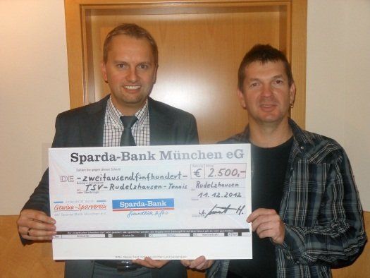 Einen Spendenscheck in Höhe von 2500,- Euro durfte der Geschäftsstellenleiter der Sparda-Bank Pfaffenhofen, Herr Hermann Klement dem Abteilungsleiter des TSV Rudelzhausen, Herrn Michael Ewerling überreichen. Die Spende soll dem Bereich der Jugendförderung des Tennisvereins des TSV Rudelzhausen zugute kommen. Die Sparda-Bank München eG fördert die Jugendarbeit in der Region sehr stark. Die Mittel dafür werden aus dem Etat des Sparda-Gewinnsparvereins zur Verfügung gestellt. Bei der Sparda-Bank München eG ist der Einsatz für die Menschen in Oberbayern selbstverständlich und ist fest in der Unternehmensphilosophie verankert.