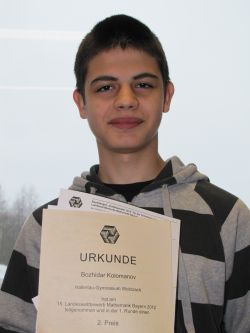 Mathematik eine Sprache für alle!? Auf jeden Fall für Bozhidar Kolomanov, der als Gastschüler am Unterricht einer 9. Klasse am Hallertau-Gymnasium Wolnzach teilnimmt und beim Landeswettbewerb Mathematik in der ersten Runde einen 2. Preis erringen und sich damit für die nächste Runde qualifizieren konnte. Obwohl Bozhidar erst in den Sommerferien von Bulgarien nach Deutschland gekommen ist, stellen mathematische Fragestellungen in deutscher Sprache scheinbar kein allzu großes Hindernis für ihn dar.
