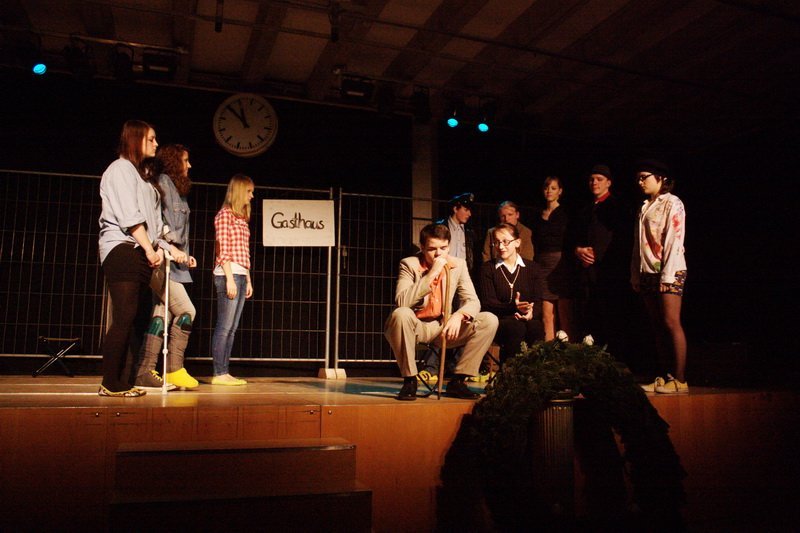 Meisterlich inszenierten die Schüler des Grundkurses „Dramatisches Gestalten“ Dürrenmatts Klassiker „den Besuch der alten Dame“, und ernteten am Ende der zweistündigen Aufführung tosenden Applaus. „Es war wirklich eine gelungene Vorstellung“ so Christian Heller, stellvertretender Schulleiter.