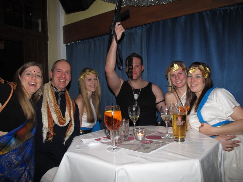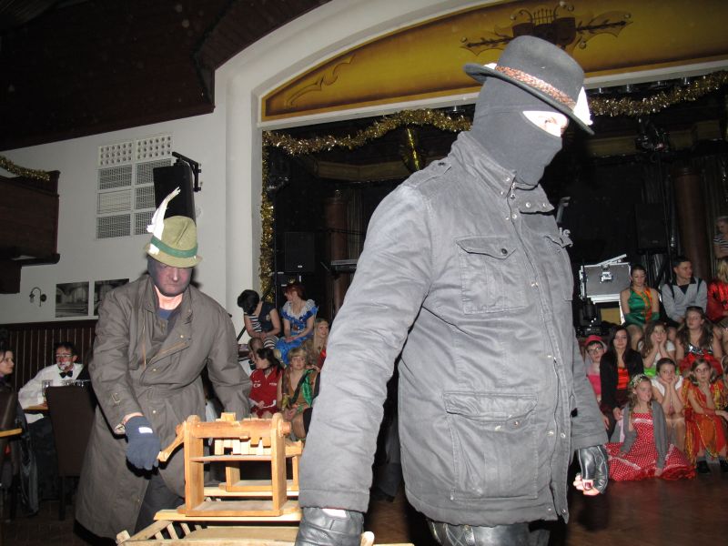 Die dunklen Gestalten wussten so einige lustige Geschichten, wie vom „Schirmsolot“ bei der Übertragung der Schirmherrschaft an Bürgermeister Josef Reiser zum 90-jährigen Bestehen des Trachtenvereins; vom neuen Hund der Limmer’s, der draußen alleine Angst hatte und den Nachbarn mit seinem Gejaule den Schlaf raubte, bis die Hilda und der Stefan beim Hund im Zwinger schliefen; vom Traurig Hans, der so wichtig ist, dass er ohne Handy nicht aus dem Haus geht und er es deshalb auch auf das Feld mitgenommen hat, wo er es aus Versehen einackerte; vom Kabelschacht - Desaster des Florian Frank; vom nie erreichbaren City-Manager; die G'schicht vom Lippe Franz seiner Wildsautreibjagd; vom Narrhalla Präsidenten Martin Mayer, der beim Sport ein oranges T-Shirt anhatte, und sich dem Angriff einer Stansen- und Fliegenarmada nicht mehr erwehren konnte und viele andere.