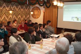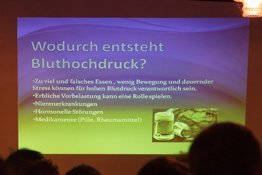 Dr. Ruchnewitz verdeutlichte die wichtigen Aspekte des Themas in seiner Präsentation durch zahlreiche Beispiele und Grafiken – beispielsweise eine Angiografieaufnahme, die einen bevorstehenden Gefäßverschluss zeigt – um dem Publikum das Thema so einfach und detailliert wie möglich näher zu bringen. Bluthochdruck ist deswegen so gefährlich und man wird zunehmend davon gewarnt, da es beispielweise zu Nieren-, Augen- oder Herzschädigungen kommen kann. Desweiteren steigt das Risiko für Schlaganfälle und Herzinfarkte. Durch den Druckanstieg in den Blutgefäßen werden diese überlastet und infolge dessen nimmt das Volumen des Herzens über längere Zeit zu. Zwar hört man oft, dass Sportler größere Herzen haben, da der Körper einer größeren Sauerstoffzufuhr bedarf, allerdings ist dies nicht 1:1 auf den Herzkreislauf eines normalen, durchschnittlichen oder unterdurchschnittlich sportlichen Menschen anzuwenden. Die Hypertonie kann in diesem Fall zu einer Abschwächung der Pumpfunktion des Herzens führen und Organe bzw. das Gehirn könnten vom Sauerstoff unterversorgt werden, was zu typischen Schwindelanfällen führen kann. Zur Behandlung werden diverse Blutdruck senkende Medikamente herangezogen werden, was aber vielleicht nicht unbedingt die beste Lösung darstellt. Vielmehr ist es wichtig, körperlich aktiv zu sein (z.B. Joggen, Walken, Golfen, Schwimmen), überflüssiges Körpergewicht abzubauen, seine Ernährung anzupassen und den Nikotin- und Alkoholkonsum zu reduzieren. Besonders Biergenießer könnten durch die eine oder andere Halbe weniger das Blutdruckrisiko senken. Dr. Ruchnewitz empfiehlt weiterhin die eigenständige Messung des Blutdrucks. Messgeräte können in der örtlichen Apotheke erworben werben und dienen sowohl der Eigenkontrolle als auch als Anhaltspunkt für den Hausarzt, wenn man die Messungen regelmäßig durchführt.