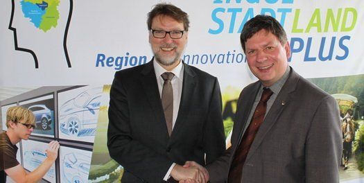 Der Vorsitzende der Initiative Regionalmanagement Region Ingolstadt e.V., Pfaffenhofens Landrat Martin Wolf (links), begrüßt Schrobenhausens Bürgermeister Dr. Karlheinz Stephan (rechts) als neues Mitglied der IRMA.