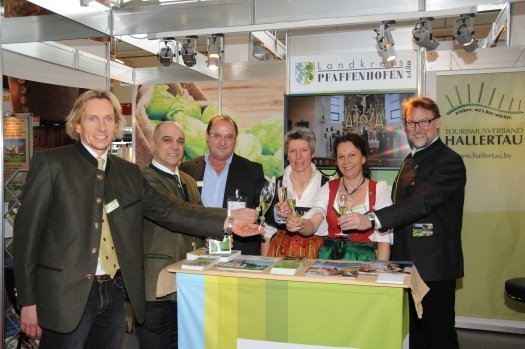 Am Stand vom "Landkreis Pfaffenhofen" informierte das Messe-Team des Vereins zum Hopfakranzlfest in Vohburg und verteilte die Neuauflage der Broschüre "Hallertauer Hopfenreise" sowie die Falt-Broschüren "Gehen Sie Entdeckungsreise". Landrat Martin Wolf unterstützte das Team tatkräftig. Bei einem Glaserl Hopfen-Secco, der Perlwein in dem auch Hallertauer Hopfen steckt, wurden erfolgreiche Gespräche mit Reisegruppenveranstalter und interessierten Reisenden geführt.