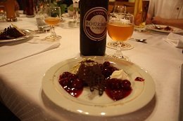 „Auch hierzu kann man ohne weiteres ein gutes Bier servieren“, so Christian Leibig. Bier zum Nachtisch? Ein Stirnrunzeln ging durch den Saal. Doch der Experte sollte auch in diesem Punkt recht behalten. Während die Bedienungen Mousse au chocolat servierten, konnte Biersommelier Christian Leibig dazu mit einem wirklich einzigartigen Bier aufwarten. Ein Oak-aged Doppelbock-Bourbon. „Dieses Bier ist nach der Gärung rund 10 Monate in Eichenfässern gelagert worden. Dadurch dass in diesen Fässern zuvor auch Whiskey gelagert wurde, bekommt dieses Bier ein ganz besonderes Aroma.“