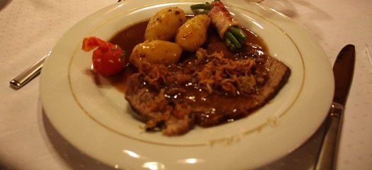 „Zum Hauptgang haben wir ein besonderes Schmankerl für sie vorbereitet“, so Lorenz Reich. Ein Rinderbraten vom irischen Weideochsen gepaart mit einem dunklen Doppelbock aus dem Brauhaus Wallerstein sorgten für einen wahren Gaumenschmaus. „Normalerweise würden viele hierzu einen guten vollmundigen Rotwein trinken, doch dieses Bier passt ebenso perfekt zum Hauptgang wie ein guter Wein“, so ein zufriedener Gast. Und während sich die Gäste noch den Braten und das ausgezeichnete Bier schmecken ließen, liefen in der Küche schon die Vorbereitungen für den eigentlichen Höhepunkt des Abend – die Nachspeise.