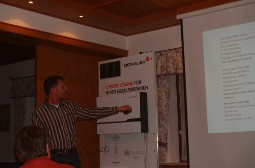 Martin Hillebrand, Geschäftsführer der Freising Solar GmbH, übernahm den zweiten Teil des Vortagabends und zeigte eine Möglichkeit der Stromspeicherung. Um den eigenen Strom auch nachts nutzen zu können, kann man den tagsüber nicht verbrauchten Strom in einer Batterie speichern. Es gibt sogenannte Bleibatterien und Lithiumbatterien, und Martin Hillebrand erklärte ausführlich die Vor- und Nachteile dieser beiden Speicherbatterien.