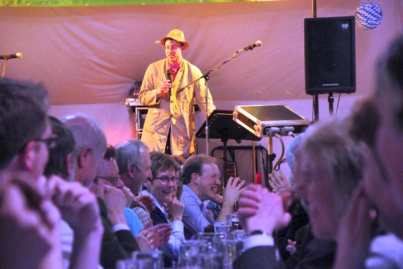 An Florian Erdle war es heuer, die Scheyrer Persönlichkeiten ebenso wie lokale diskutierte Themen aufs Korn zu nehmen. Und um es vorweg zu nehmen: er tat dies in einer beeindruckend professionellen Art unter Berücksichtigung auch kleinster Details, wobei er aber niemals jemanden oder etwas ins Lächerliche zog oder brüskierte. Das Feuerwerk an Spitzen und Pointen kann man in einem solchen Artikel gar nicht wiedergeben; das Publikum jedenfalls kam aus dem Lachen und "auf-die-Schenkel-Klopfen" gar nicht mehr heraus. Zumindest einige Kostproben sollen dem Leser einen Eindruck vermitteln.