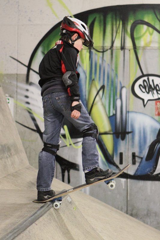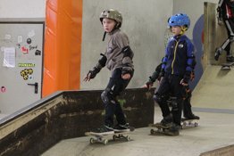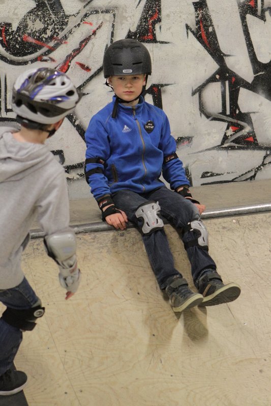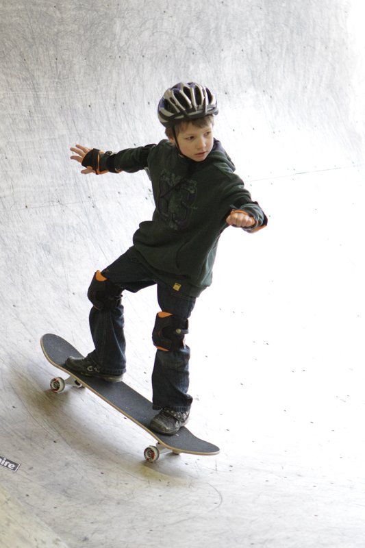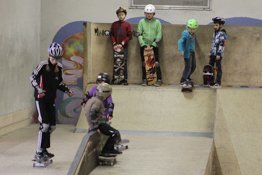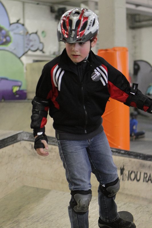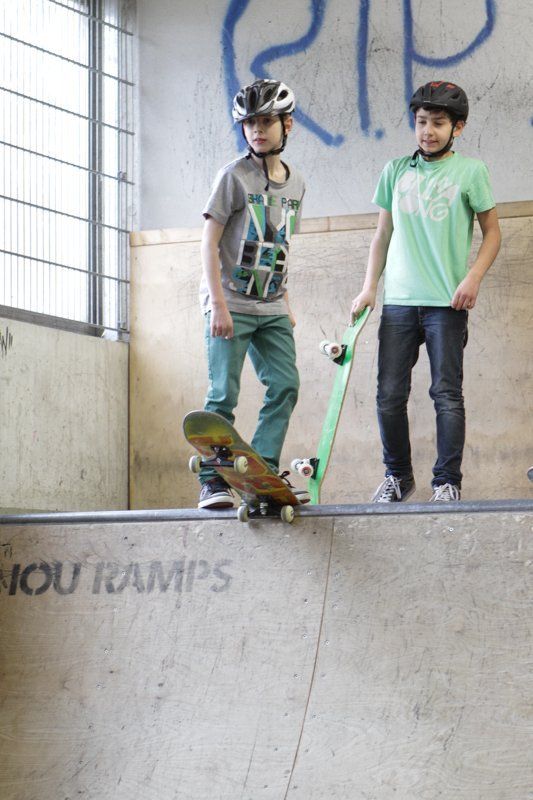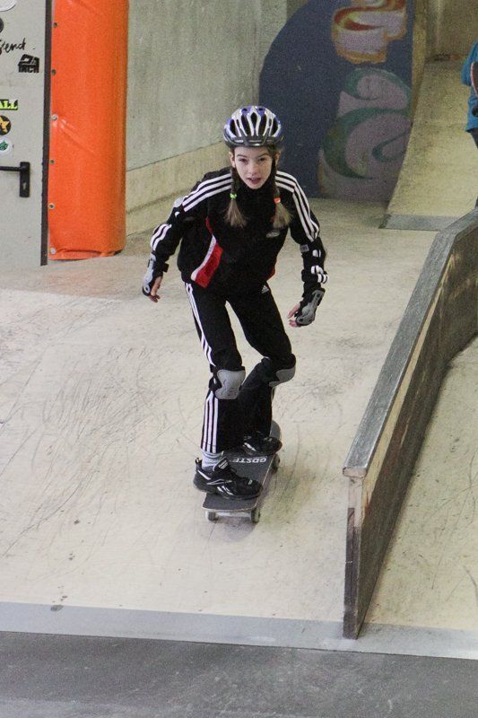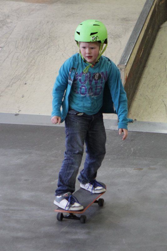 Zwischen sieben und 14 Jahren waren die Sprösslinge alt, die in dieser Woche viel über den Funsport lernten. So galt es zunächst das sichere Fahren und einen festen Stand auf dem Brett zu erlernen, bevor es auf die sogenannten „Obstacles“ ging. Darunter versteht man die Elemente eines Skateparks wie z.B. Quarterpipes. Unter den Kindern waren einige, die etwas mehr Erfahrung hatten und somit schon große Quarterpipes befuhren. Doch hier musste sich keiner langweilen, denn es gab zahlreiche Rampen, die man hoch- und runterfahren konnte. Niemand sah sich gezwungen, eine steile Rampe hinunterzufahren, wenn man sich nicht traute. Da man sich bei dem ganzen Spaß auch leider sehr leicht verletzen kann, bestand natürlich Schutzpflicht mit Arm- und Beinschonern sowie Helmen. Für diejenigen, die sich schon an Tricks wie den Kickflip (Board dreht sich einmal um die Längsachse) oder den Ollie (der Sprung mit dem Skateboard, die Grundlage für viele Tricks) herantrauten, gab Chris Rieger viele Tipps und Tricks. Denn solch ein Flip erlernt man nicht einfach von heute auf morgen – hier steckt viel Übung und Körperbeherrschung dahinter.