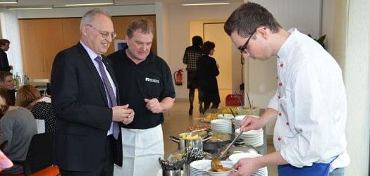 Insgesamt verkochte Alfred Kügel 40 Kilo Rohkartoffel und bewirtete damit 47 Mitarbeiter der Bank, allein 20 Liter Suppe waren darunter, drei große Pfannen Bratkartoffeln. Daneben gab es vier Bleche Ofenkartoffeln und fünf Liter Kartoffelgulasch sowie Salz- und Pellkartoffeln mit verschiedenen Salaten und Dips.