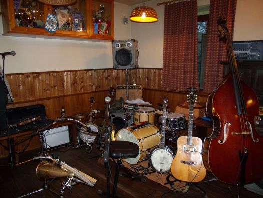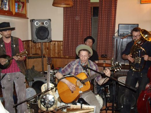 Ein Konzert ist angesagt im Stilwirt, und zwar das letzte in dieser Session, erst im Oktober geht es weiter mit den Musik-Acts. Heute steht die Donkeyhonk Company (der Wolnzacher Lametto und seine Bandkollegen) auf der Bühne. Sie waren es, die draußen rumstanden und tatsächlich gewartet haben – denn ihnen fehlt ihr Bassist Pedl. Er wird doch nicht verloren gegangen sein? Trotzdem gehen die Bandmitglieder erst einmal an ihre Instrumente, stimmen sie, checken die Verstärkeranlage und warten. Dann endlich: die Tür geht auf und Pedl mit Freundin kommt. Lametto macht einen Scherz wenn er sagt, der Pedl musste wegen seines Mondkalenders erst mal seinen Garten fertig machen. Aber Scherz beiseite: Die Band ist komplett. Die Instrumente sind vielseitig und warten auf ihren Einsatz: Banjos, Gitarren, Geige, Kontrabass, Mandoline, Tenorhorn, Schlagzeug – alles da für einen Abend mit wippenden Fußspitzen oder leichten Tanzbewegungen, wenn auch nur im Sitzen.