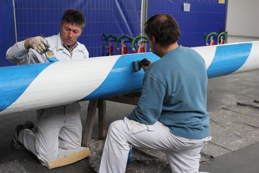 Nachdem der drei Jahre alte Maibaum auf dem Pfaffenhofener Hauptplatz letzten Monat von Bauhof-Mitarbeitern „gefällt“ wurde, wartet die neue, 27 Meter lange Fichte aus dem Stadtwald nun auf ihren großen Auftritt. Die Maler des Bauhofs haben den Baumstamm bereits traditionell weiß-blau gestrichen, so dass der Maibaum am Dienstagabend aufgestellt werden kann.