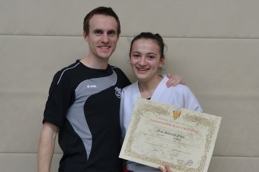 Nach der sogenannten Poomsae (Formenlauf) beeindruckte Sümmeye ebenfalls im Zweischrittkampf, im Vollkontakt Zweikampf sowie in der Selbstverteidigung. Auch die letzte Hürde der Prüfung, dem Bruchtest, meisterte Sie souverän, so dass Sie am Ende der Prüfung vom Bundes- und Landesprüfungsreferenten Wilfried Pixner die begehrte Dan-Urkunde in Empfang nehmen konnte und ab sofort den schwarzen Gürtel im Taekwondo tragen darf.