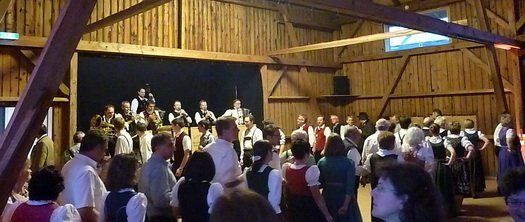 Um die zweihundert Volkstanzbegeisterte hatten sich schon früh eingefunden, die besten Plätze waren schnell besetzt und Norbert Stocker in der Küche bekam richtig Arbeit. Wenn die Musik zum Tanz aufspielt, wollten schließlich alle auf dem Tanzboden sein und nicht vor dem Teller sitzen. Von sechzehn bis geschätzten neunzig war die Altersstrecke in Jahren, den Tanzkünsten nach ist das sowieso zeitlos. Größtenteils in Tracht, bewegten sich die Tanzpaare zum Auftakt in einer Art Polonaise im Walzerschritt durch den ganzen Stockerstadel.
