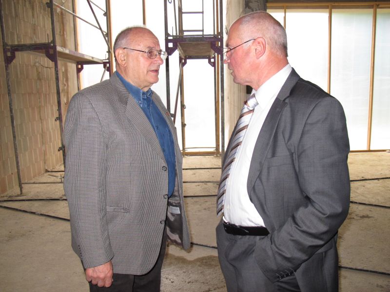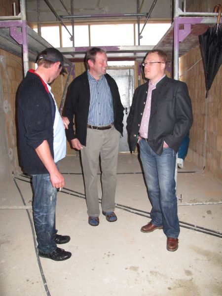 Nach dem Anbringen des geschmückten Baumes am Innengerüst, da es draußen wie aus Eimern schüttete, gab es zur Feier des Tages warmen Leberkäs mit Kartoffelsalat, Brezen und Semmeln, sowie allerlei Getränke. Danach konnten die Räumlichkeiten besichtigt werden. Vor allem die Kindergärtnerinnen schauten sich ihren neuen Arbeitsplatz sehr genau an und schienen sehr erfreut darüber zu sein was sie sahen.