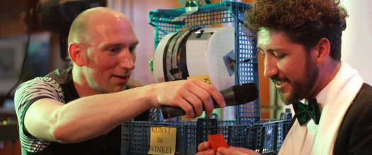 Auf den nächsten Act freuten sich schon viele im Publikum: Joe Heinrich! Der frühere Comiczeichner und gebürtige Schotte tritt aktuell mit seiner Puppensammlung auf. Am Donnerstag war Joes Ali-N mit von der Partie – das Alien, das zwar „in friedlicher Absicht“ gekommen ist, demnächst jedoch „total ohne Blutvergießen“ die Weltherrschaft übernehmen will. Leider hatte er allerdings im Weltall einen Unfall – er ist mit der Enterprise zusammengestoßen. Captain Kirk flog mit Alkohol am Steuer. Auf die Frage, ob er die Jedi-Ritter holen soll, antwortete ihm der Captain anscheinen nur mit „Hicks - Scotty repariert dir das.“ Zum abwechslungsreichen Programm gesellte sich außerdem Picco hinzu – Beruf: Jongleur. Trotz der geringen Deckenhöhe schaffte er es mit aberwitzigen Tricks und Kniffen das Publikum zu begeistern. Bälle und Keulen – alles warf er durch die Luft. Auch fünf Keulen gleichzeitig jonglierte er wie wild. Für einen Laien kaum vorstellbar, doch mit über 20 Jahren Erfahrung konnte Picco selbstverständlich zeigen, was er drauf hat. Der darauffolgende Musikact war eine Reise zurück zum Stil der Nachkriegszeit, zurück zu Hildegard Knev. Man stelle sich eine verrauchte Bar vor, eine Sängerin mit Hut und ihre Band. Mit „verrucht, aber mit Charme“ kündigte Tobias Christian Mayer Vokalistin Michaela Wallner mit ihrer Band „Böse Katze Liebchen“ an. Nach bislang nur vier Proben feierte die Band an diesem Donnerstag bei Kunst im Winkel ihre Premiere.