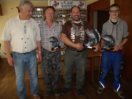 Bei den Erwachsenen siegte Vater Stefan Grasschopp, der zusätzlich noch die Ehrenfischerkette umgelegt bekam, vor Dominik Schleicher und Oliver Scheurer. Sie erhielten als Pokal eine große Fischskulptur.