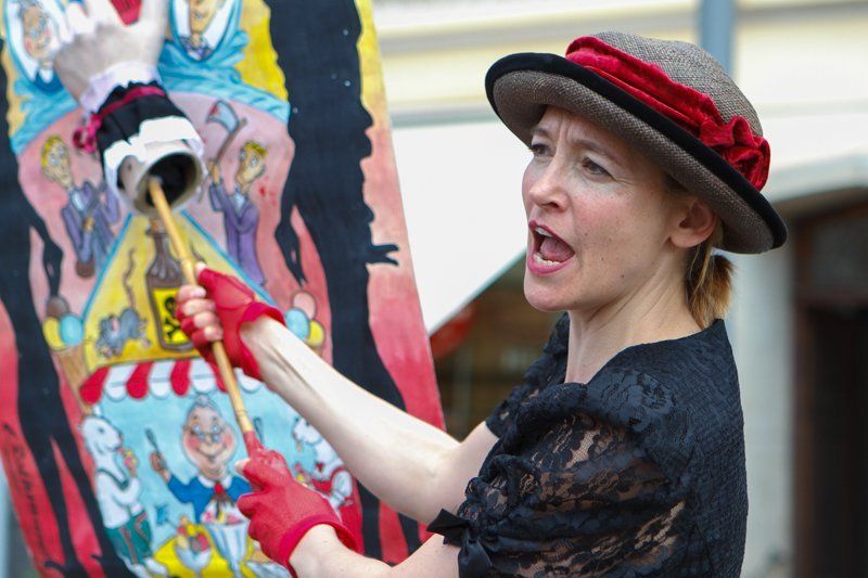 Stets mit dabei: Der Zeigefinger, mit dem Serena immer auf die liebevoll gestalteten Bildchen auf den Plakaten zeigte und die Drehorgel, die nach Loulous Angaben schon über 100 Jahre alt ist. Passend zum sonnigen Wetter passt zwar ein leckeres Eis, doch „Der Mord in der Eisdiele“ erscheint da schon eher schauderhaft. In dieser Moritat von Karl Valentin geht es um eine ältere Dame, die sich einen Jungspund anlächelt, welcher allerdings nur an ihr Erspartes ran will. Er beschließt, sie kurzum um die Ecke bringen zu wollen, doch Mausgift, Revolver und Beil waren ihm zu grausig. Er lud sie in die Eisdiele ein, wo Annemarie vom Eis nicht genug bekam und letztendlich am übermäßigen Verzehr der kalten Leckerei erfror.
