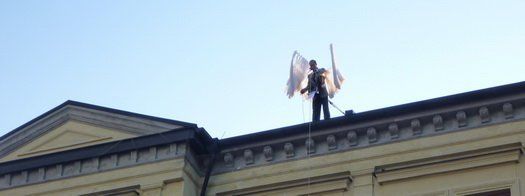 Dann war er da der Engel, hoch droben auf dem Dach der alten Mädchenschule mit weiten weißen Schwingen, eine Zigarette rauchend und eine Schreibmaschine vor dem Bauch. Die Heimaterde mit Bepflanzung, sein Geschenk für die Ewigkeit, zog er sich selbst an einem Korb in seinen Himmel. Weiße Papierflieger mit himmlischen Botschaften segelten herab und die eine oder andere Feder fand ihren kindlichen Fänger. Die feine, schöne Geschichte, die sich in der Form niemand hatte vorstellen können, wurde mit langem, dankbarem Applaus belohnt.