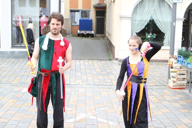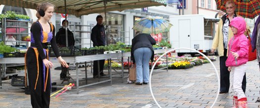Besuch aus Augsburg bekamen die Pfaffenhofener Wochenmarktbesucher am vergangenen Samstag. Das Künstlerduo „Fantômes de Flammes“ zeigte vor allem den Kindern, wie man spielend Jonglieren und das Tanzen mit dem Hula-Hoop-Reifen lernte.