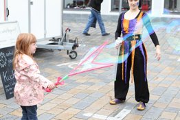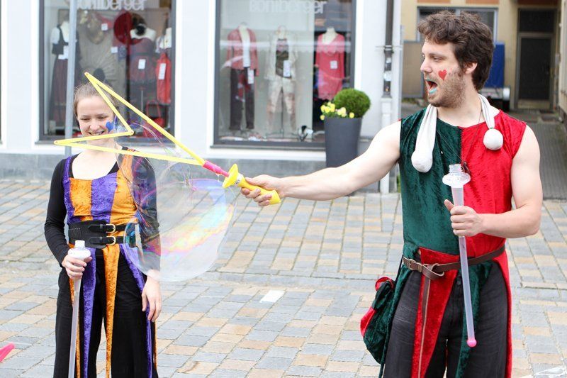 Am Samstag demonstrierten sie in Pfaffenhofen vor allem die Grundelemente ihrer Shows. Die Auftritte waren vor allem für Kinder gemacht, die auch selbst mitmachen durften. So freuten sich die Kleinen beispielsweise über riesige selbstgemachte Seifenblasen, die quer durch den Wochenmarkt flogen.