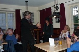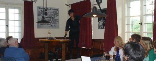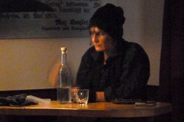 Nicht nur gerufen wurde, der Tod hat geweint und gelacht, gesungen und geturnt, er hat uns seine Sense gezeigt und sein neues himmlisches Handy, die Philosophie des Sinns, des Wesens vom Sein, den bayerischen Konjunktiv und seinen Facebook Account, bis dass der Kirschgeist ihn schlafen ließ. Mit einer überragenden schauspielerischen Leistung gelang es Olivia Wendt, dem Tod eine weibliche, ja fast androgyne - dem himmlischen Personalmangel geschuldet - Figur und ein menschliches Gesicht zu geben. Die Stimmungen wechselten wie die Farben des Schafkopfspieles in Falco Blomes Text. Die Mundartpassagen wechselten mit klar rezitierten deutschen Klassikern. Ihr größtes Pfund spielte Wendt mit ihrer breitbandigen Singstimme aus: Ein fast opernhafter bassiger Tod neben einem alkoholschwangeren Tenor donnerte durch die älteste Wirtstube Pfaffenhofens. Adi Descy, der neue Wirt in altehrwürdigen Mauern, bekam, vom Tod zugewiesen, an diesem Abend seine erste tragende Rolle.