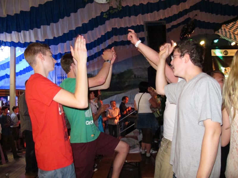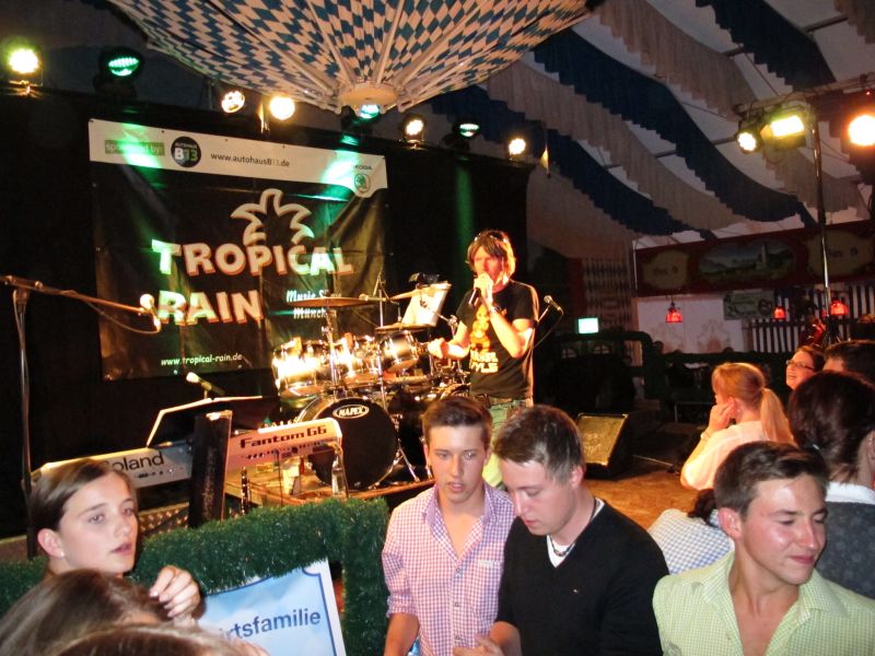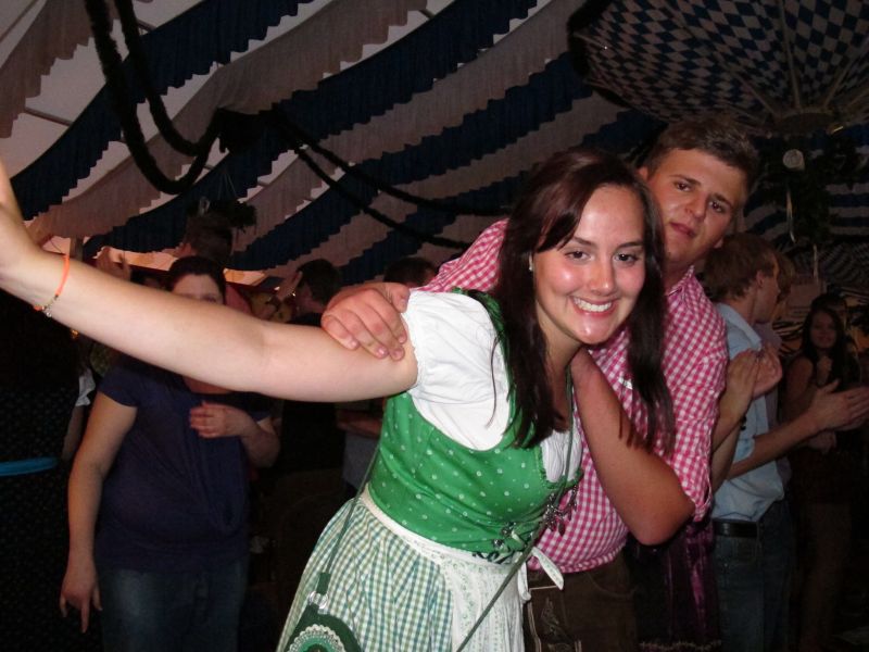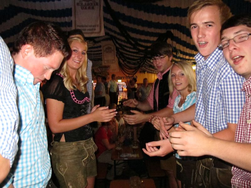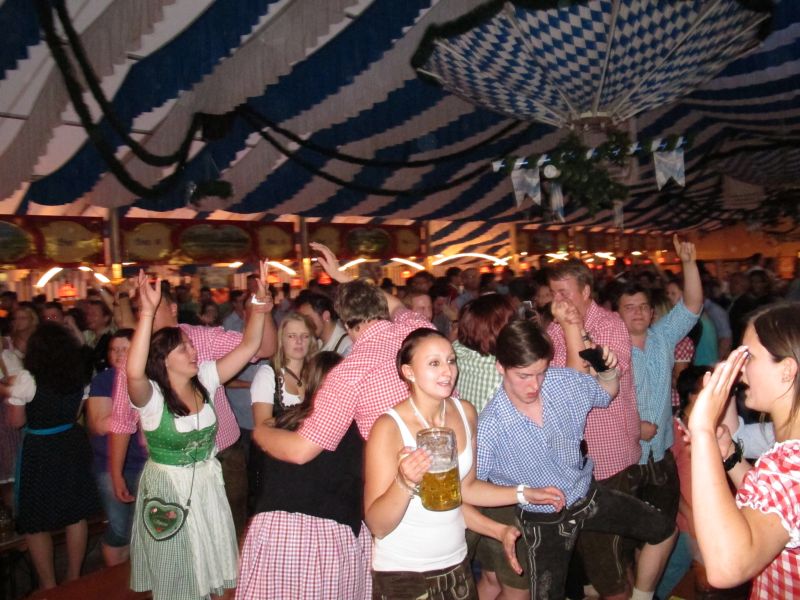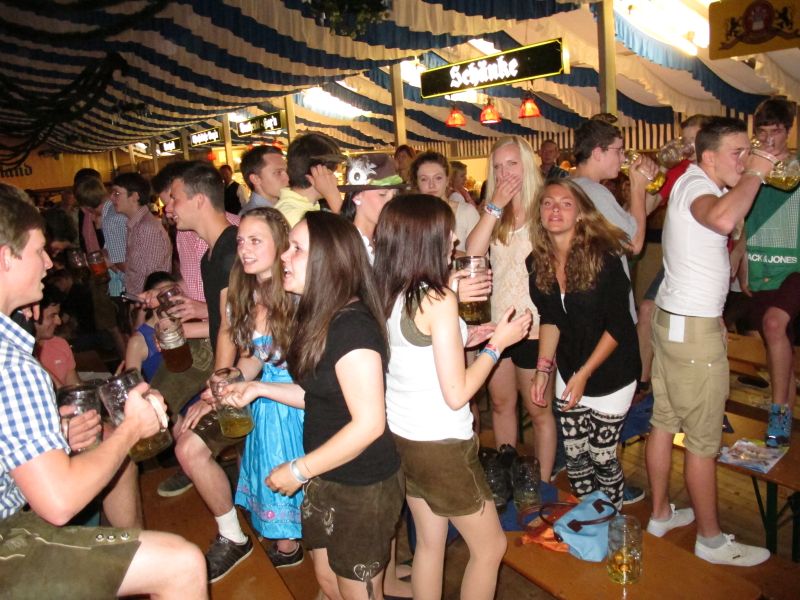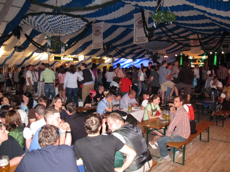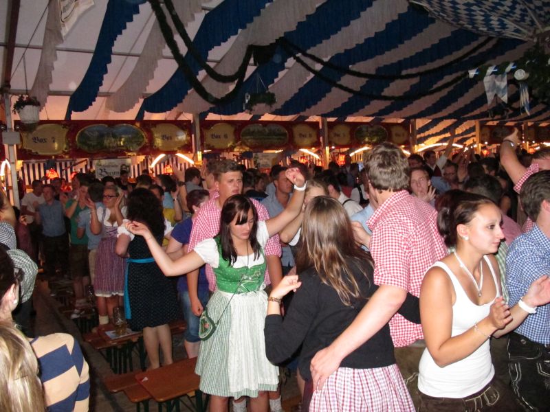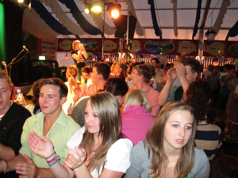 Schon von weitem hörte man die Partylieder und den vielstimmigen Gesang der Volksfestbesucher dazu. Kam man näher, sah man ein halbes Zelt gefüllt mit jungen Leuten auf Bierbänken stehend, die sich mehr hüpfend als tanzend zum Takt bewegten.