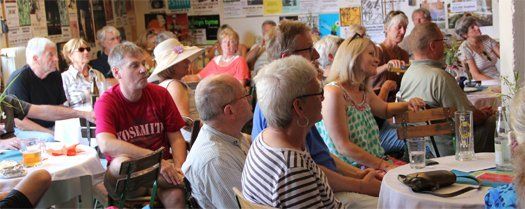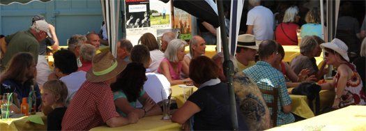 Die Plätze unter den schützenden Pavillons vor der KulturWerkhalle waren als erstes besetzt. Schatten war gesucht bei dann irgendwann über 30° Außentemperatur. Kühle Getränke, dazu ab mittags Feinstes vom Grill, Salate oder Käseplatten. Zwischenzeitlich fanden Besucher gar nur schwer freie Plätze; eine Reisegruppe aus der Nähe von Zürich hatte von der Veranstaltung gehört und kam mit fast 50 Personen, eine Bullock-Oldtimer-Truppe kam zufällig vorbei und machte ebenfalls Station. Aber die Gäste des Incontri sind unkompliziert und packen auch selber an. Da wurden Bänke und Tische schnell einmal in Eigenregie in den Schatten unter angrenzende Bäume gestellt oder die Stehtische so verrückt, dass man nicht mehr der prallen Sonne ausgesetzt war.