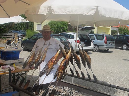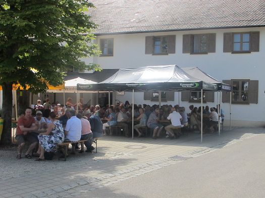 Gleich nach dem Festgottesdienst ging es rüber in den Wirtshof, wo die Schützen bereits alles bestens vorbereitet hatten. Es gab Grillfleisch und Grillgemüse, eine Salatbuffet und natürlich Steckerlfisch. Die Männer am Grill waren allerdings nicht zu beneiden, ihnen floß der Schweiß in Strömen. Die Getränke mussten vom Wirt gekauft werden, das Essen war frei, allerdings konnte man eine Spende für die Schützen abgeben.