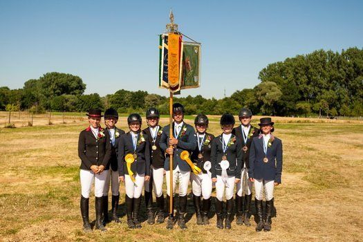 Insgesamt gab es bei den Meisterschaften sechs Kategorien: „Bambinis“, „Dressur-Junioren“, „Dressur-Reiter“, „Springen-Junioren“, „Springen-Reiter“ und die Mannschaftswertung. Im Mannschaftswettbewerb nahmen im Gesamten acht Mannschaften teil, davon ritten zwei für die Pferdefreunde Euernbach. Team I bestand aus Stefanie Sulcz mit Diara, Ralf Groß mit Annahofs Scoty, Melissa Braun mit Bijou und Melanie Wenger mit Asterix. Die Mannschaftsführerin war Julia Braun. Das zweite Team, welches gebildet wurde durch Linda Thorpe mit Luna, Tanja Kufer mit Lantino, Carina Braun mit Rossini und Melissa Braun mit Calimero, wurde von Renate Kufer gelenkt. In der Auftaktprüfung – eine A*-Dressur- zeigte das erste Team unter der Führung von Julia Braun bereits eine starke Vorstellung. Mit einer Gesamtbewertung von 20,7 lagen sie, nach dem die erste Wertungsprüfung abgeschlossen war, auf den zweiten Rang. Auch das zweite Euernbacher Team konnte sich dank einer souveränen Vorstellung zwischenzeitlich mit der Gesamtnote von 19,4 auf den fünften Platz rangieren. Spannend wurde es sodann in der zweiten Wertungsprüfung, einer Springprüfung Klasse A*. Jeder Reiter einer Mannschaft hatte die Aufgaben den 1,05m hohen Parcours möglichst schnell und fehlerfrei zu absolvieren. Nach dem einige Reiter die Hindernisse überwunden hatten, hatten beide Teams aus Euernbach eine hervorragende Ausgangsituation, denn jeweils die ersten drei Reiter überwanden die Hindernisse fehlerfrei. Folglich konnte der letzte Reiter versuchen, die Gesamtzeit etwas zu verbessern, da nur jeweils die drei besten Ergebnisse eine Teams gewertet wurden. Das Team, welches von Renate Kufer angeleitet wurde, schickte als letzte Reiterin Linda Thorpe ins Rennen. Mit einer sehr schnellen und strafpunktfreien Runde konnte sie das Gesamtergebnis der Mannschaft nochmals verbessern. Durch diese vier Spitzenleistungen des Teams konnte die Mannschaft II das Springen für sich entscheiden. Auch Melissa Braun, die als letzte Reiterin für die Mannschaft Euernbach I an den Start ging, riskierte viel, jedoch wurde ihr eine Stange zum Verhängnis und so beendete sie mit 4 Fehlerpunkte den Umlauf. Für das Team I reichte es in dieser Wertungsprüfung für den dritten Rang.