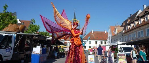 Nein, keine wilden Tiere oder Salto Mortale vom Rathausturm, hinter dem „Staatszirkus“ verbergen sich Evelyne und Bernhard Weigl aus Pfarrkirchen in ihren herrlichen Stelzengängerkostümen. Rot für die sowieso vorhandene Hitze und blau für erhoffte Kühlung derselben war die Wahl der Kleidung der Artisten an diesem Wochenmarktsamstag. Sommer in der Stadt heißt die Veranstaltungsreihe der Wirtschafts- und Servicegesellschaft der Stadt Pfaffenhofen, die jeden Samstag von 9.30 Uhr bis 12.30 Uhr stattfindet.