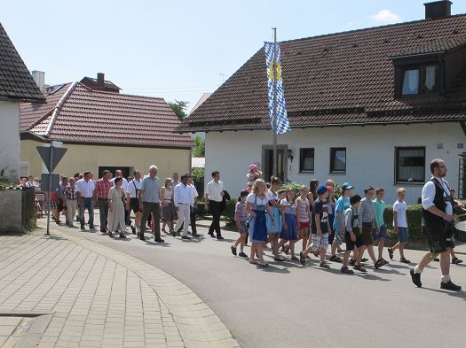 Die Organisatoren des Pfarrfestes, der Pfarrgemeinderat und zahlreiche Bürger der Ortsgemeinde von Au schlossen sich ihnen an. Neben dem Feuerwehrhaus waren Zelte aufgestellt, die vor der Hitze und den angesagten Gewittern schützen sollten. Für die Kinder gab es ein Riesenluftkissen, das allerdings anfangs so heiß war, dass es die meiste Zeit leer stand. Später konnten sie dann auch noch Luftballons steigen lassen.