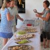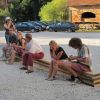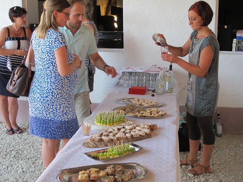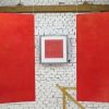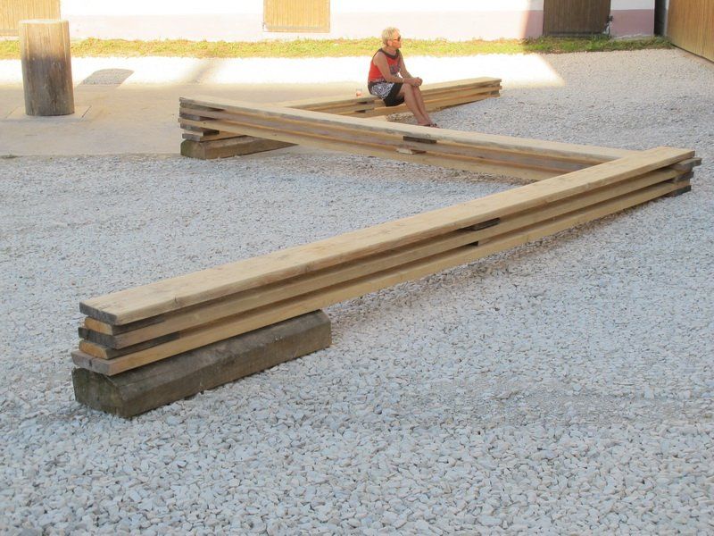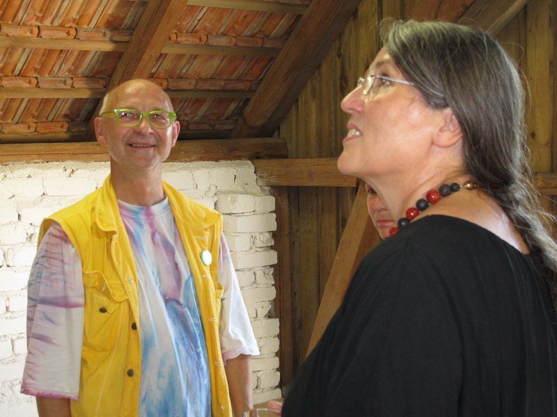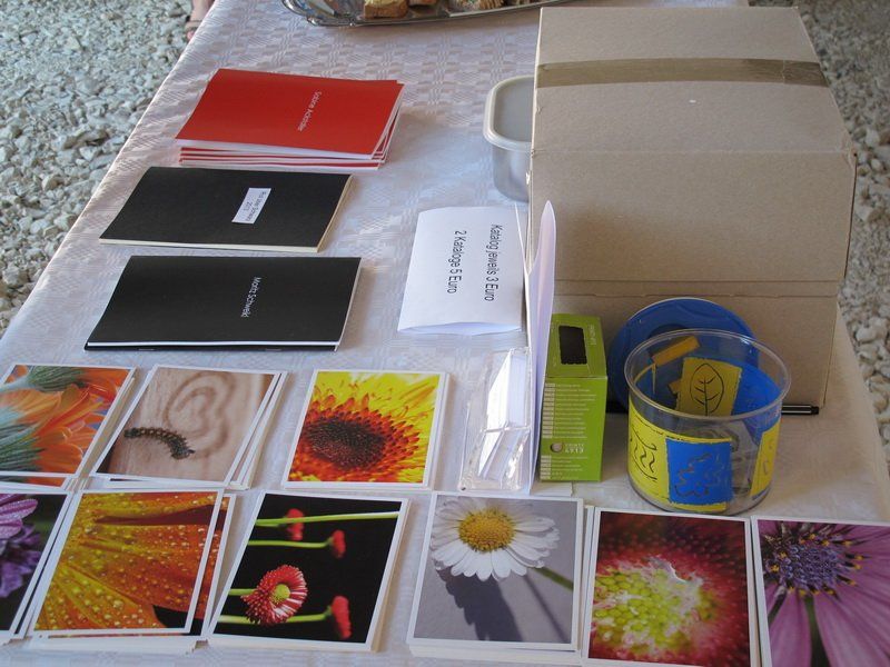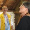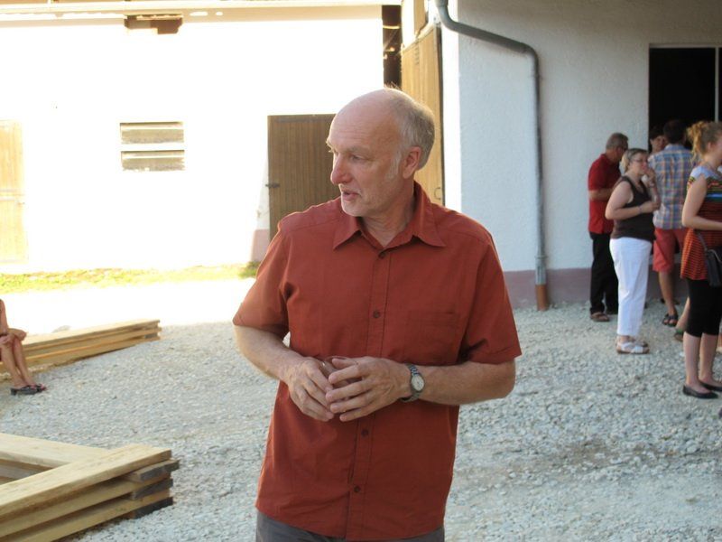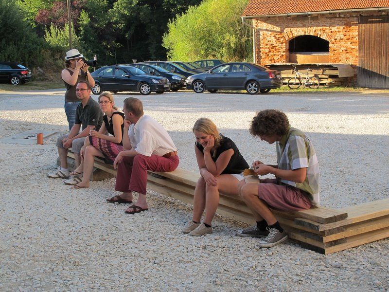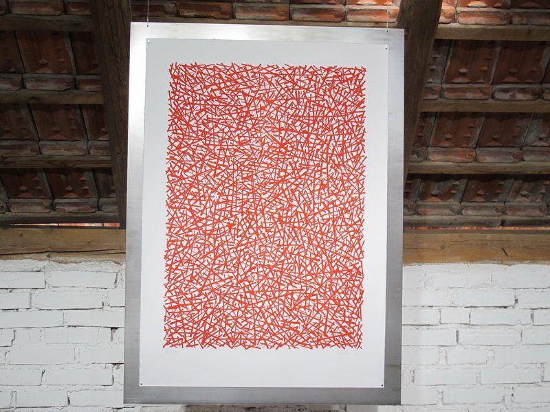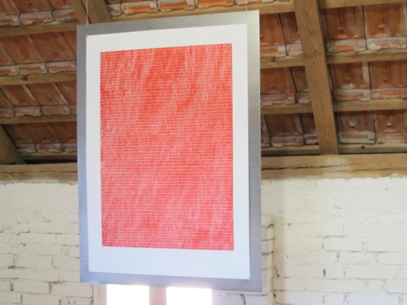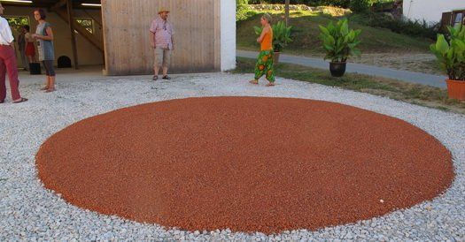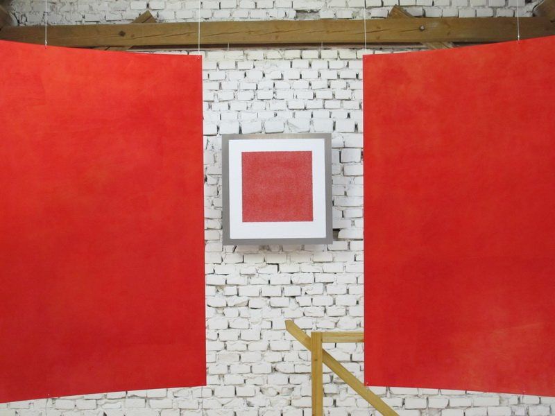 Große Arbeiten im Hof schaffen erste Einblicke, dass hier ganz konsequente Künstler wirken, auch wenn eine Holzskulptur als Bank von den Gästen in Anspruch genommen wurde. Die zwei Ebenen der Scheune gliedern sich auch farblich: im Erdgeschoss nur schwarz, geometrische Grafiken und Bodenskulpturen, im Obergeschoss: rote Arbeiten, ein großer Kreis, innen ebenfalls rot gestrichen. Alles sehr puristisch, klar. Eine echte Galerie. Und das in Hüll! Sabine Ackstaller studierte an der Akademie Halle, Moritz Schweikl in München bei Prof. Pitz.