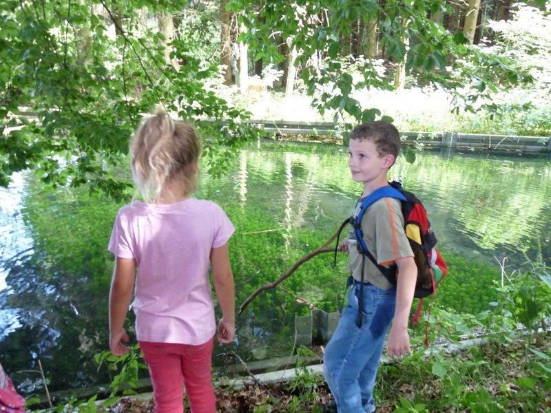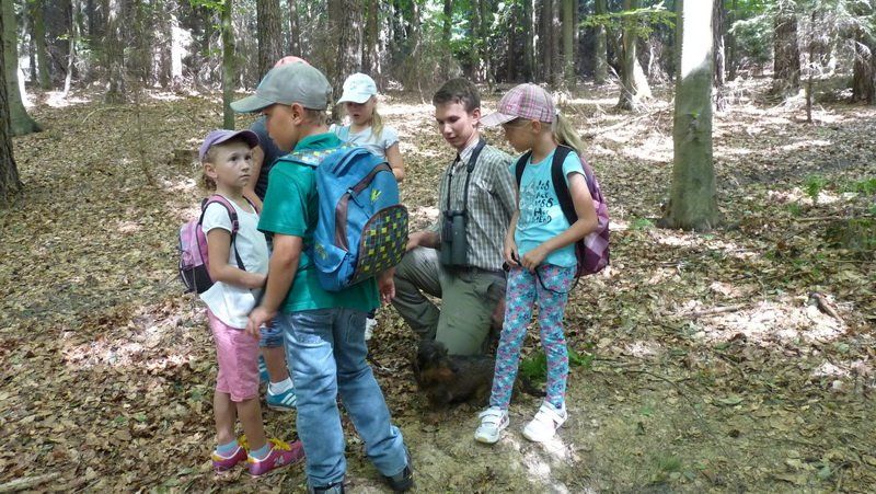 Auch während des Spaziergangs ließ sich aber in jeder Ecke etwas Neues entdecken, wozu die Kinder Fragen stellen konnten - schöne Federn, Löcher im Boden, verschiedene Äste oder eine Ansammlung von Waldameisen, zu denen Alois Widmann den Kindern gleich ihre Aufgaben als Nützling erklärte. Doch auch Spuren jeglicher Art wurden von den Kids gefunden und identifiziert. So lernte die Gruppe, dass der aufgewühlte Waldboden auf nahrungssuchende Wildschweine zurückzuführen ist, welche Spuren zu welcher Tierart gehören, wie man das Alter eines Baumes an den Ringen des Stammes abzählen kann, und dass die Rehe jeden Abend von ihrem Einstand auf die Wiese wandern, um dort zu äsen. Zudem erklärte Alois Widmann auch, welche Aufgaben die Dackeldame Aika übernimmt und wie sein aufklappbarer Stecken zur Stabilisierung des Fernglases dient.