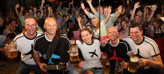 Ein Hit jagte den nächsten. Doch das Wolnzacher Partyvolk beließ es bei weitem nicht nur beim Tanzen und Feiern, stimmgewaltig füllten sie die Pausen mit eigenen, ganz speziellen Interpretationen altbekannter Gassenhauer. „Die Stimmung ist wirklich absolut gigantisch“, so Chefpilot Rudi, dem es natürlich jedes Jahr aufs Neue extrem viel Spaß macht, vor heimischem Publikum zu spielen. Und so heizte die gesamte Flugmannschaft ihren Passagieren ordentlich ein. Während Kapitän Rudi am Schlagzeug den Beat vorgab und Xari seinen Bass zum Beben brachte, haute Bordingenieur Kurt kräftig in die Tasten. Auch Tragflächenenteiser Stefan machte an diesem Abend wieder einen absolut perfekten Job und erzeugte eine komplett eisfreie Zone, indem er seine Gitarre zum Glühen brachte. Hier durfte natürlich auch Chefstewardess Eva nicht fehlen, die an Bord für eine optimale Verpflegung mit heißen Rhythmen sorgte.