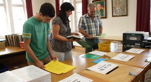 V.l.n.r.: Benedikt Fahn, Heidi Gernet und Alfons Send bei den Vorbereitungen zur Briefwahl im Rathaus. (Foto: F. Maier)
