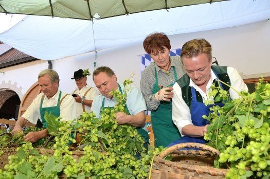 Auch das gehört zum Wahlkampf: Wett-Hopfenzupfen auf der Bühne mit politischen Gegnern aber auch Freunden - wie hier beim Hopfazupfajahrtag in Scheyern.