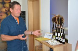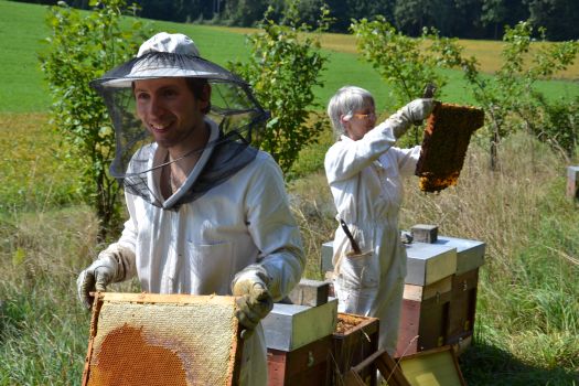 Albrecht Pausch, der früher im Marketing eines US-Multis tätig war, hatte sich schon von früh für Insektenvölker und ihr Verhalten interessiert. Und so kam es 1989, dass er eines Tage eine Anzeige im Lokalblatt las, dass zwei Bienenvölker zu verkaufen seien. Bei seiner Frau stieß er damit sofort auf heftige Ablehnung, doch inzwischen ist Helga Pausch Meisterin der Tierwirtschaft im Bereich Bienen und Albert Pausch selbst bezeichnet sich als „Knecht“. Wie das Leben so spielt: Albert Pausch beendete seinen Marketingposten, bei dem er ständig weltweit unterwegs war und siedelte mit gut 120 Bienenvölkern von Reisgang nach Unterschnatterbach um. Inzwischen verfügt das Paar über 250 Bienenvölker, die, je nach Zeit und Pflanzen-/Baumart zu den Blüten transportiert werden müssen.