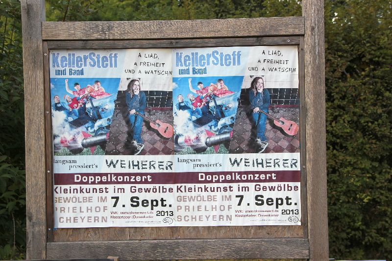 "Kritische bayrische Heimatlieder" seien seine Songs, so der Münchener Liedermacher und Kabarettist Weiherer am Samstagabend in Scheyern. Und quasi als Verstärkung bei seinem Auftritt hat er niemand Geringeren als die Keller Steff Band mitgebracht. Da war es gut, dass bei ausverkauftem Haus die Tische und Bänke draußen blieben, im Prielhof-Gewölbe hätte es ohnehin niemanden auf den Plätzen gehalten.
