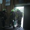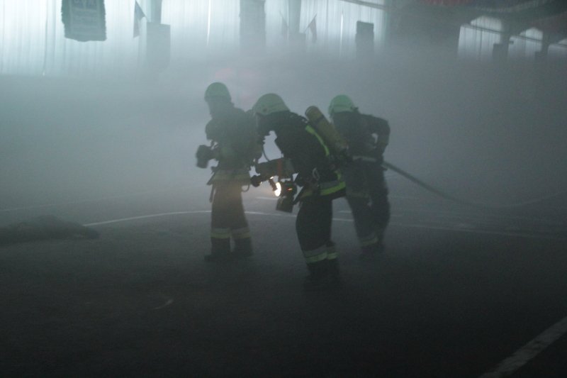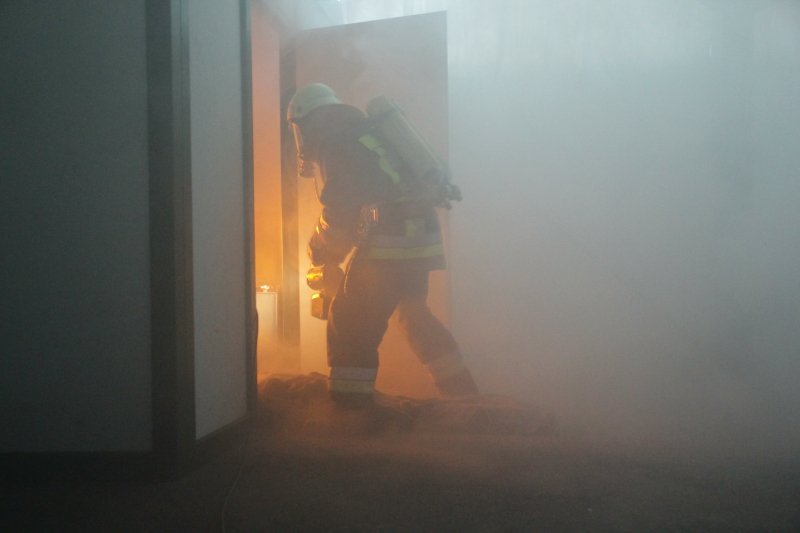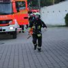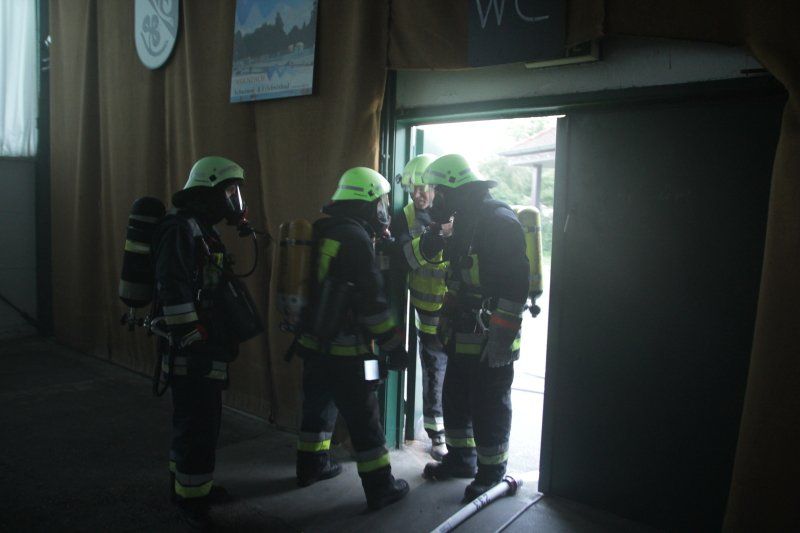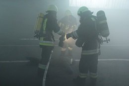 Und was er nur wenige Minuten später sah, damit konnte er sehr zufrieden sein. Schon kurz nach der Alarmierung waren die Floriansjünger mit dem HLF, der Drehleiter und dem LF 16 vor Ort. Nachdem sich die Feuerwehrler unter Kommandant Werner Fuchs einen ersten Überblick über die Situation verschafft hatten, folgte auch schon der erste Innenangriff. Drei Atemschutzträger, ausgestattet mit einer Wärmebildkamera und einem C-Schlauch für den Erstangriff, drangen in die verrauchte Volksfesthalle ein, um die drei noch vermissten Personen zu retten. Schnell und sicher bewegte sich der Trupp und konnte innerhalb weniger Minuten die erste vermisste Person aus dem Gefahrenbereich retten. „Wichtig ist in diesem Zusammenhang nicht nur das perfekte Zusammenspiel der Feuerwehrmänner, sondern auch der ständige Funkkontakt sowie die elektronische Überwachung der Atemschutzträger“, erläuterte der 2. Kommandant.
