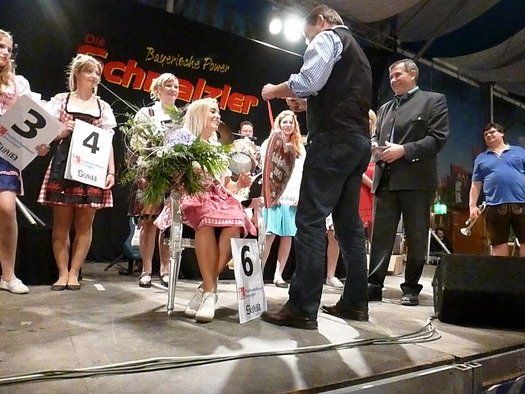 Maßkrug stemmen, Reise nach Jerusalem und Kleidersammeln nach Zeit dienten als lockere, unterhaltsame Wettbewerbe zum Kennenlernen, für das Wahlvolk abgehalten. Studiotechniker Nullinger hatte das selbige hervorragend im Griff, unterstützte die Mädels auch in den Pausen und gab sogar noch eine Gesangseinlage. Bürgermeister Albert Gürtner und Festwirt Lorenz Stiftl gratulierten anständig mit Busserl, Blumenstrauß und Geldpreisen (1. Preis 500,– €, 2. Preis 250,– €, 3. Preis 100,– €).